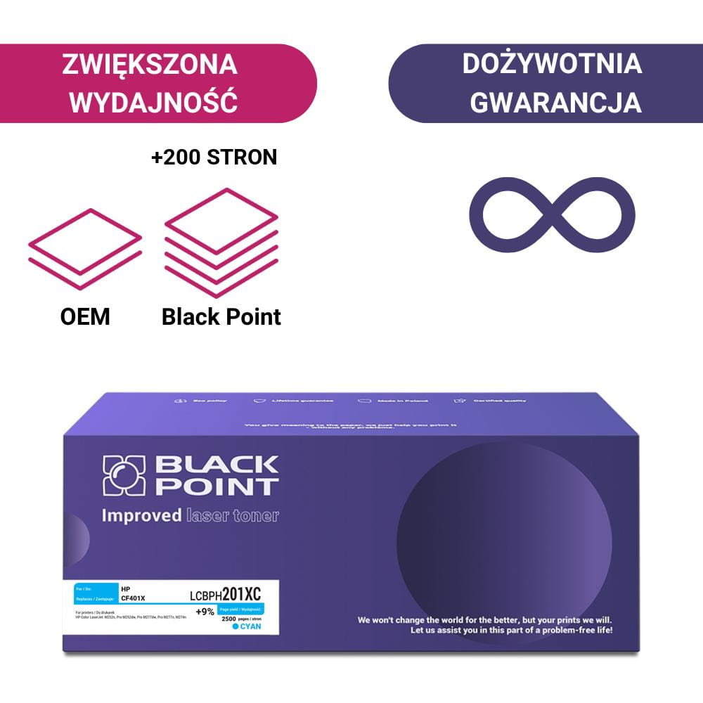 Toner laserowy Black Point LCBPH201XC. Zastepuje HP CF401X. Kolor: cyan. Wydajnosc: 2500 str. (wiecej o 200 str. od OEM - ISO 19752). Kompatybilny z HP Color LaserJet: M252n, Pro M252dw, Pro M277dw, Pro M277n, M274n, HP 277, HP M252, HP 252, HP M277