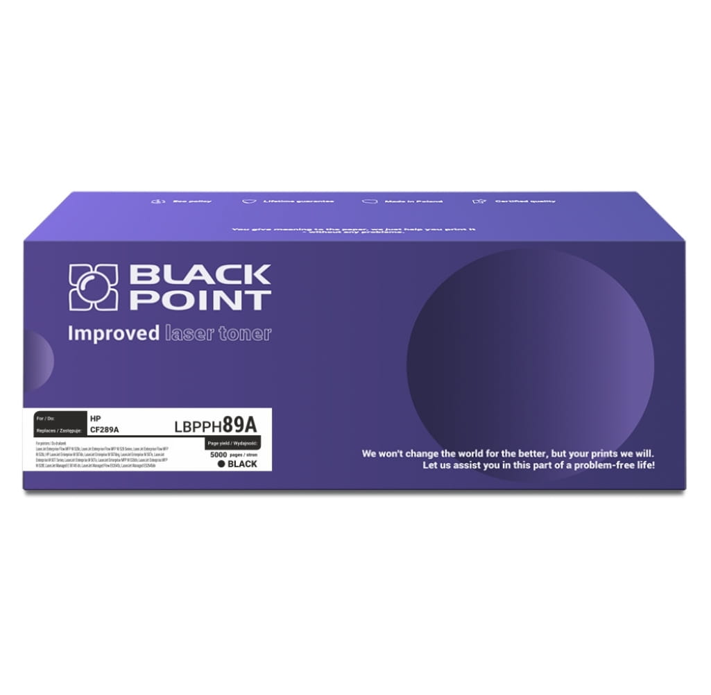 Toner laserowy Black Point Super Plus LBPPH89A. Zastepuje HP CF289A. Wydajnosc: 5000 str. Kompatybilny z HP: LaserJet Enterprise Flow MFP M 528c, LaserJet Enterprise Flow MFP M 528 Series, LaserJet Enterprise Flow MFP M 528z, HP LaserJet Enterprise M 507dn, LaserJet Enterprise M 507dng, LaserJet Enterprise M 507n, LaserJet Enterprise M 507 Series, LaserJet Enterprise M 507x, LaserJet Enterprise MFP M 528dn, LaserJet Enterprise MFP M 528f, LaserJet Managed E 50145 dn, LaserJet Managed Flow E52645c, LaserJet Managed E52645dn, CF289A, HP 528, HP 507, HP 52645, HP 50145
