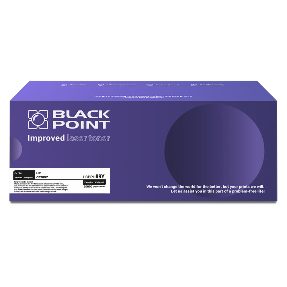 Toner laserowy Black Point Super Plus LBPPHY. Zastepuje HP CF289Y. Wydajność: 20000 str. (ISO 19752). Kompatybilny z HP: LaserJet Enterprise Flow MFP M 528c, LaserJet Enterprise Flow MFP M 528 Series, LaserJet Enterprise Flow MFP M 528z, HP LaserJet Enterprise M 507dn, LaserJet Enterprise M 507dng, LaserJet Enterprise M 507n, LaserJet Enterprise M 507 Series, LaserJet Enterprise M 507x, LaserJet Enterprise MFP M 528dn, LaserJet Enterprise MFP M 528f, LaserJet Managed E 50145 dn, LaserJet Managed Flow E52645c, LaserJet Managed E52645dn, CF289XXL, HP 528, HP 507, HP 52645, HP 50145