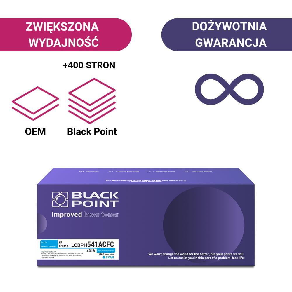 Toner laserowy Black Point LCBPH541ACFC. Zastepuje HP CF541A. Kolor: cyan. Wydajnosc: 1700 str. (wiecej o 400 str. od OEM - ISO 19752). Kompatybilny z HP: Color LaserJet Pro MFP M280nw, Color LaserJet Pro MFP M281fdn, Color LaserJet Pro MFP M281fdw, Color LaserJet Pro M254dw, Color LaserJet Pro M254nw, HP 280, HP 281, HP 254, HP M254