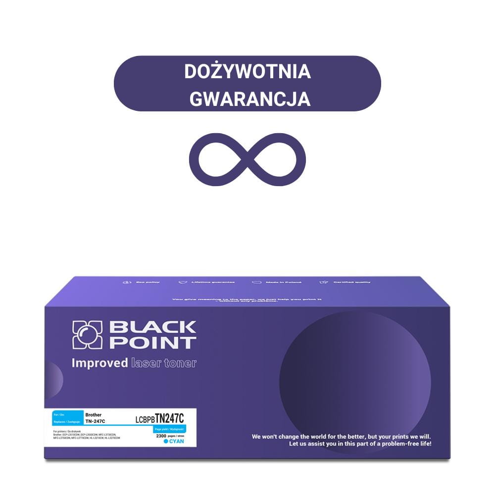 Toner LCBPBTN247C firmy Black Point z powodzeniem zastąpi przypisany mu materiał eksploatacyjny z oferty Brother, a równocześnie jest w stanie zapewnić równie wysoką wydajność. Odpowiednik ten wystarczy na wydruk aż 2 300 stron, czyli takiej samej ilości jak oryginalny kartridż marki Brother. Zamienniki tonerów oferowane w Black Point charakteryzują się bezterminową gwarancją, a tym samym bez problemów pracują do momentu pełnego opróżnienia kasety.